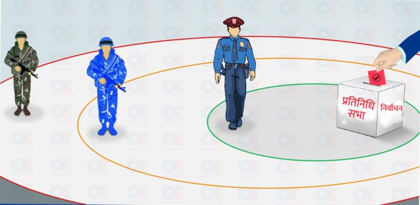 सुरक्षा व्यवस्था तीन तहको घेरामा परिचालन गरिएको छ। सबैभन्दा बाहिरी घेरामा खटिनेछ भने त्यसपछि रहनेछ। मतदान स्थलको भित्री ‘कोर’ क्षेत्रमा भने परिचालित हुने व्यवस्था गरिएको छ।