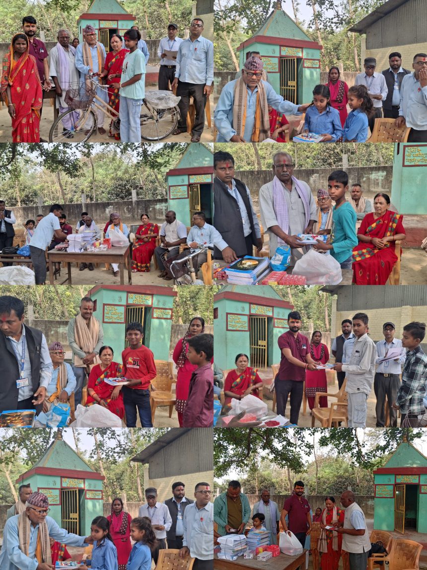 श्री नेपाल राष्ट्रिय आधारभूत विद्यालय, सितलपुरकी सहायक प्रधानाध्यापक तथा अवकाशप्राप्त शिक्षिका सुधा देवीले एक गरिब तथा जेहेन्दार छात्रालाई साइकल प्रदान गर्दै २५० जना विद्यार्थीलाई स्टेशनरी सामग्री वितरण गर्नुभएको छ।