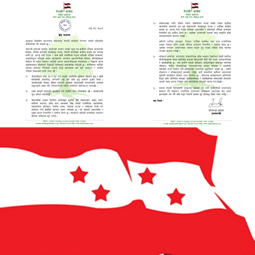 आन्दोलनमा घुसपैठका कारण सिंहदरबार, संसद भवन, सर्वोच्च अदालतदेखि निजी घर र व्यवसायिक प्रतिष्ठानसम्ममा भएको तोडफोड र आगजनी निन्दनीय र भर्त्सनायोग्य भएको विज्ञप्ति उल्लेख गरिएको छ। कांग्रेसले सरकारले वास्तविक क्षतिको आंकलन तत्काल सुरु गर्न माग गरेको छ।